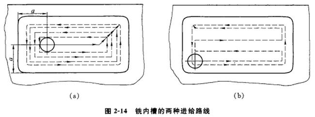(2)*短的切削進(jìn)給路線   縮短切削進(jìn)給路線既可有效地提高生產(chǎn)率,又可降低刀具的磨損。在圖2-14a中采用環(huán)切法加工內(nèi)槽;而在圖2-14b中采用行切法加工內(nèi)槽。從兩圖中比較可以知道,圖2-14b的切削進(jìn)給路線明顯比圖2-14a的短。