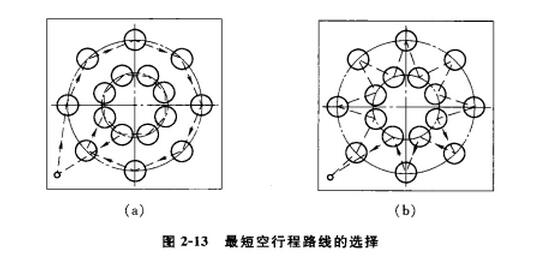?、诤侠戆才趴招谐踢\(yùn)動(dòng)路線   要加工如圖2-13所示的16個(gè)孔,按一般規(guī)律是先加工均布在同一圓周上的8個(gè)孔,再加工另一圓周上的孔(見(jiàn)圖2-13a),但對(duì)點(diǎn)位控制的數(shù)控機(jī)床來(lái)說(shuō),這并不是*短的空行程路線,如按圖2-13b所示的空行程路線進(jìn)行加工,則空行程距離的總和*小,因此可以提高生產(chǎn)率。